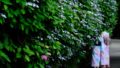 大きな杉や紅葉の木が保護するように、あじさいは静かに、または群れをなして咲いています。
