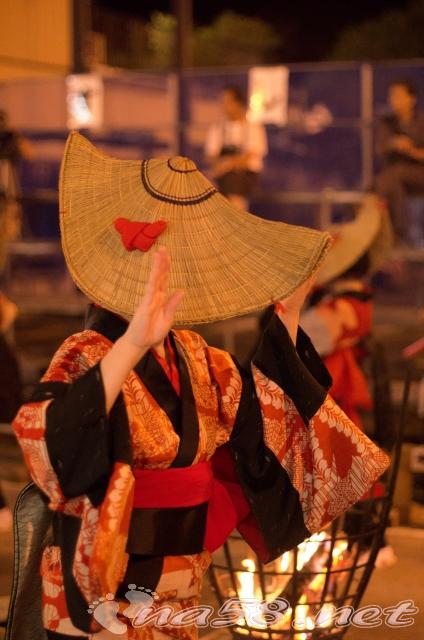成年の女性は、 編み笠をかぶり、端縫いの着物を着ます。